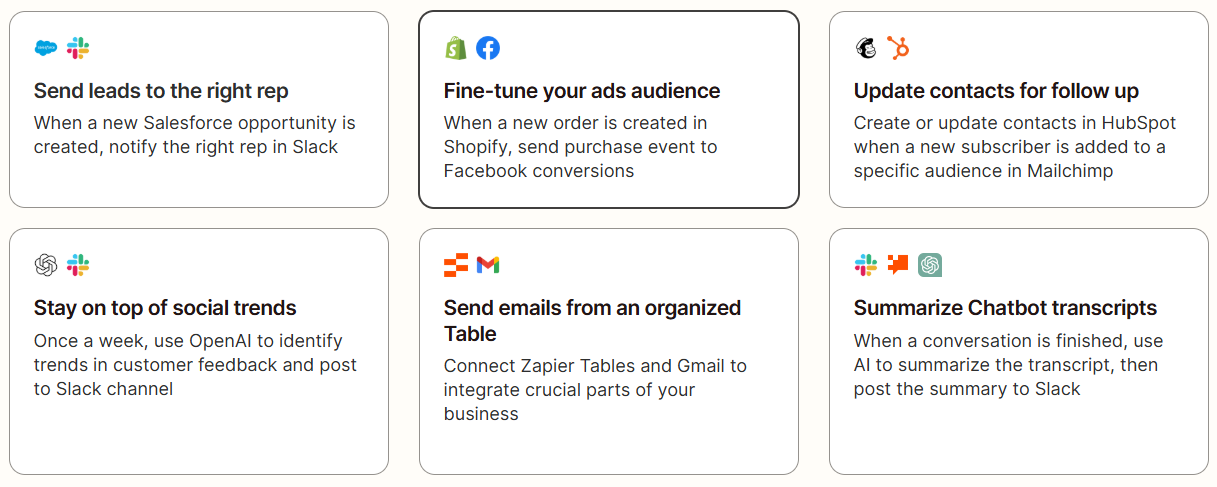 3. 다양한 템플릿 제공: 업무에 다양하게 활용할 수 있는 템플릿들을 제공하고 있어요. 일일이 설정하지 않아도 빠르게 자동화할 수 있다는 장점이 있죠! 복잡한 설정 없이도 필요 시 바로 Zapier를 활용할 수 있어요.