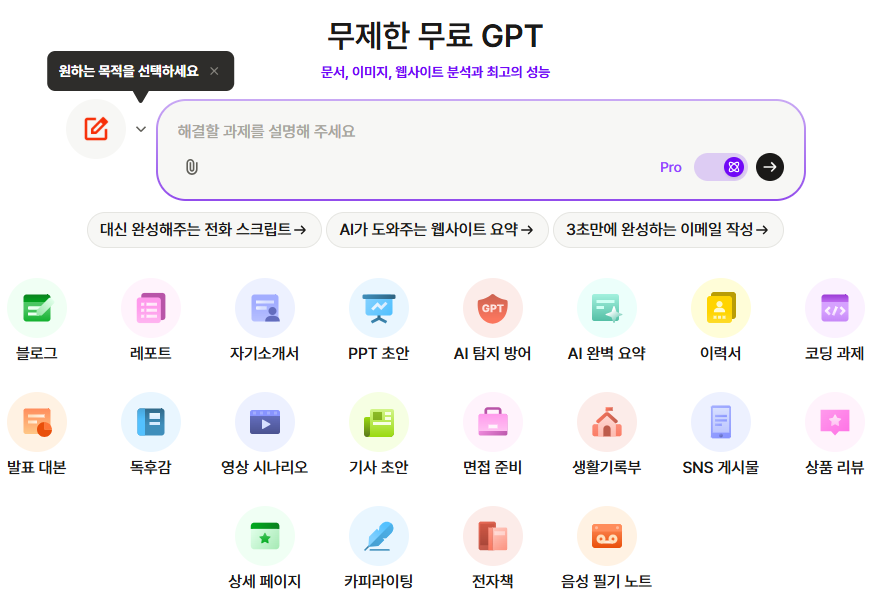 검색, 이미지 생성, 과제 업무 해결의 목적을 설정하여 더욱 적합한 답변을 얻을 수 있어요. 😎