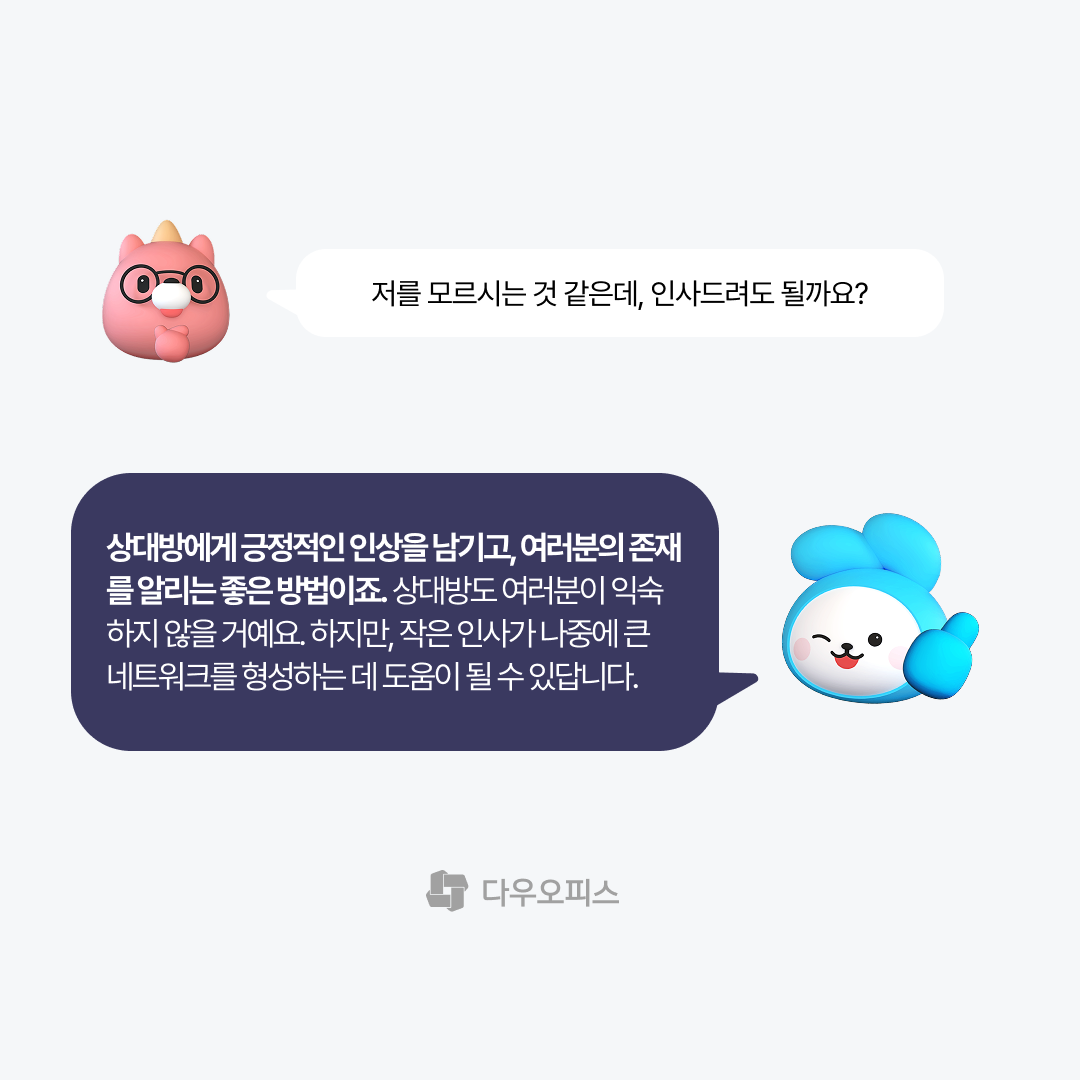 A. 상대방에게 긍정적인 인상을 남기고, 여러분의 존재를 알리는 좋은 방법이죠. 상대방도 여러분이 이익숙하지 않을 거예요. 하지만, 작은 인사가 나중에 큰 네트워크를 형성하는 데 도움이 될 수 있답니다.