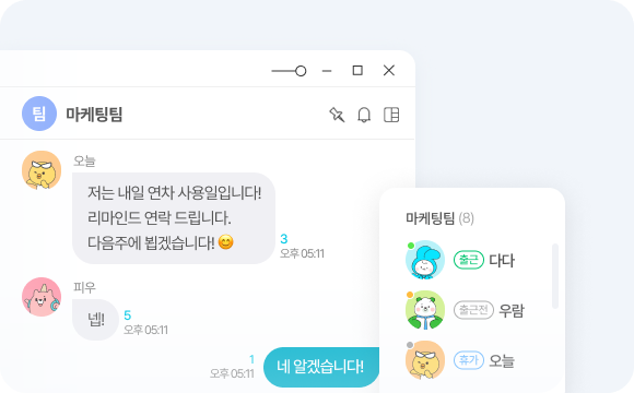 - 접속 상태 확인 및 읽음 여부 표시: 동료의 메신저(PC/모바일) 접속 및 메시지 읽음 여부를 확인할 수 있어 효율적인 의사소통