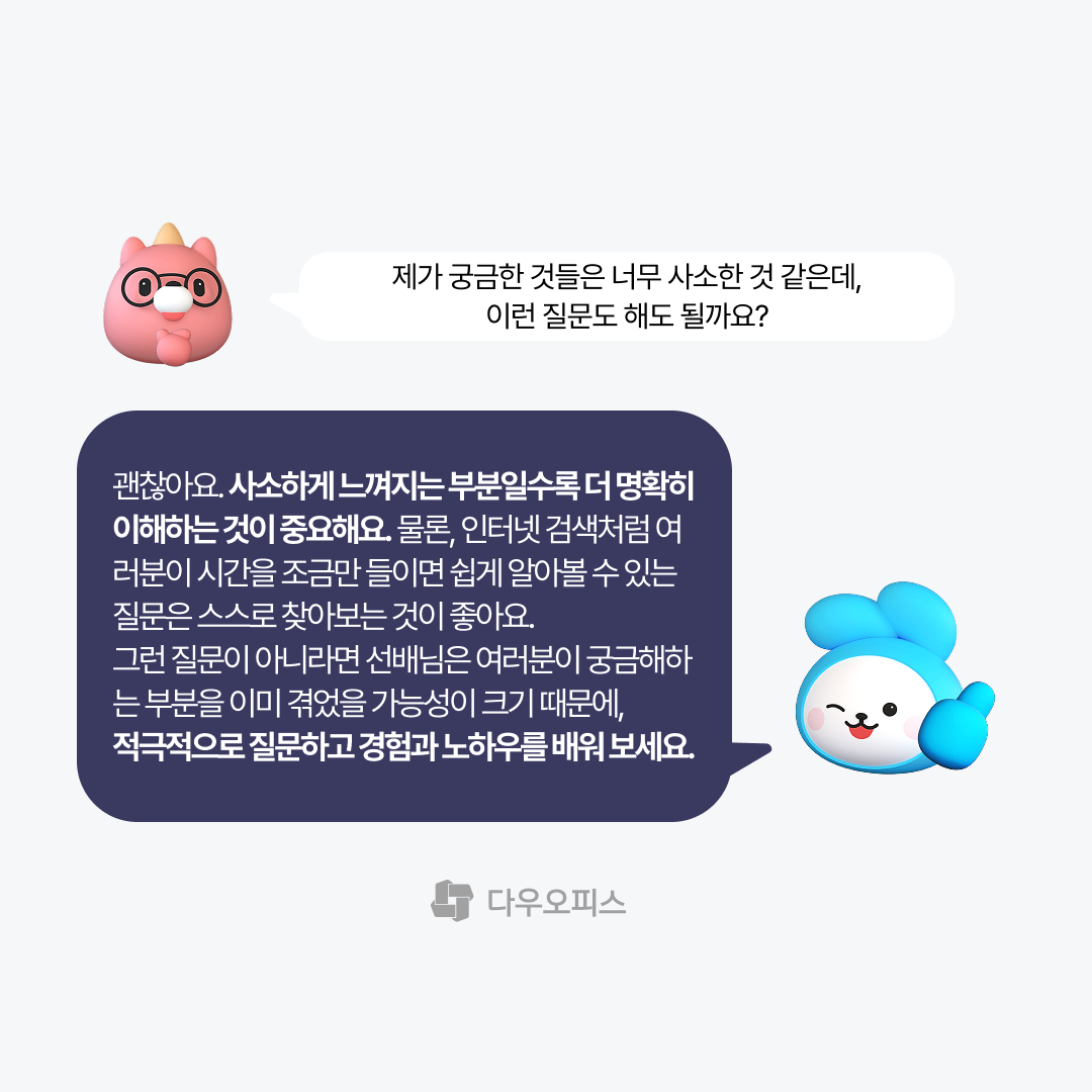 A. 괜찮아요. 사소하게 느껴지는 부분일수록 더 명확히 이해하는 것이 중요해요. 물론, 인터넷 검색처럼 여러분이 시간을 조금만 들이면 쉽게 알아볼 수 있는 질문은 스스로 찾아보는 것이 좋아요. 그런 질문이 아니라면 선배님은 여러분이 궁금해하는 부분을 이미 겪었을 가능성이 크기 때문에, 적극적으로 질문하고 경험과 노하우를 배워 보세요.