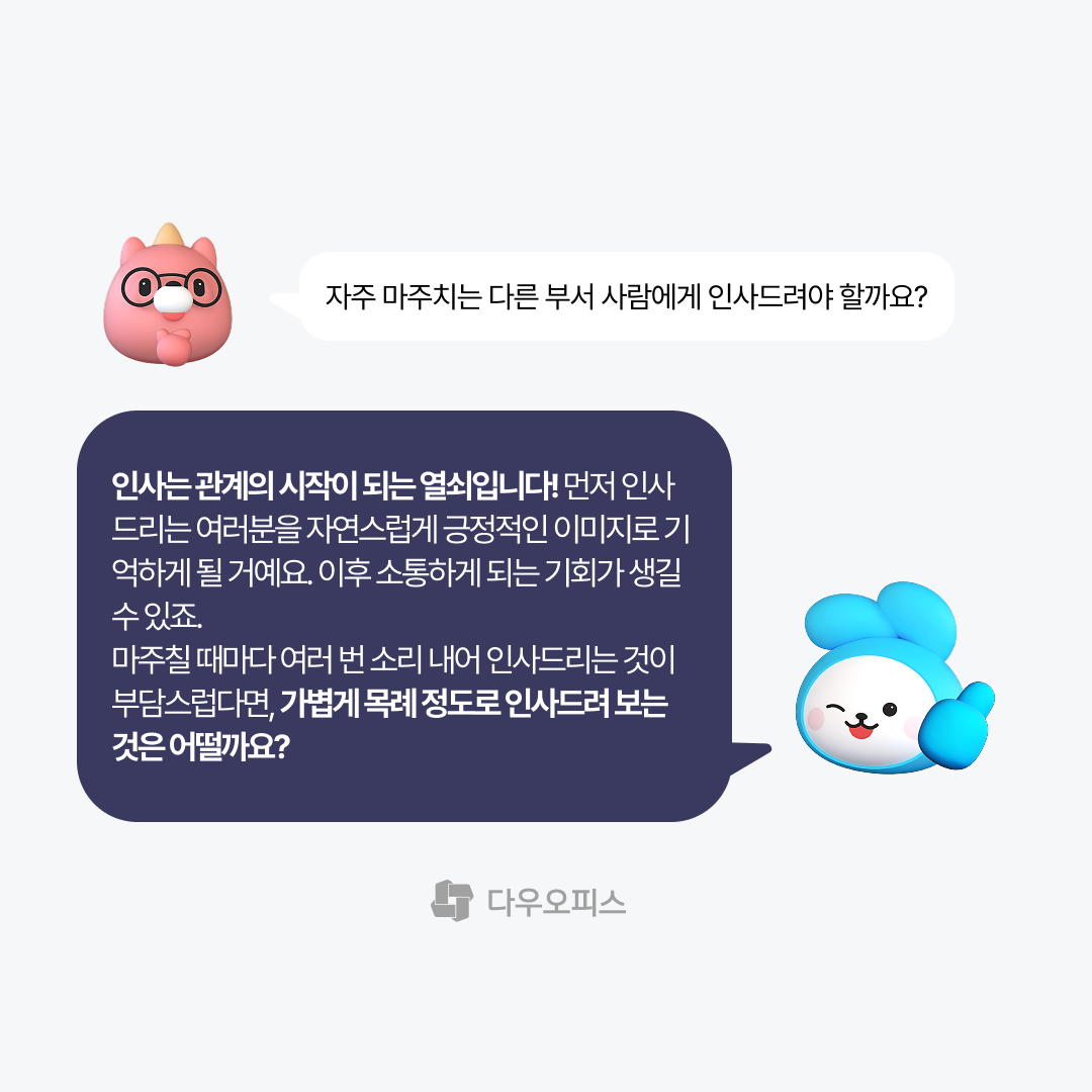 A. 인사는 관계의 시작이 되는 열쇠입니다. 먼저 인사드리는 여러분을 자연스럽게 긍정적인 이미지로 기억하게 될 거예요. 이후 소통하게 되는 기회가 생기기도 합니다. 마주칠 때마다 여러 번 소리 내어 인사 드리는 것이 부담스럽다면, 가볍게 목례 정도로 인사드려 보는 것은 어떨까요?