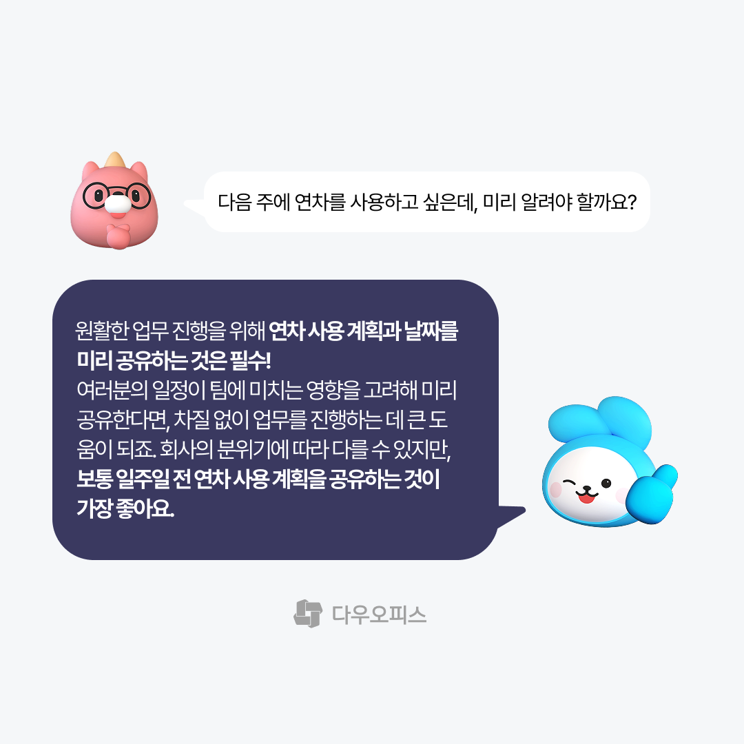 A. 원활한 업무 진행을 위해 연차 사용 계획과 날짜를 미리 공유하는 것은 필수! 여러분의 일정이 팀에 미치는 영향을 고려해 미리 공유한다면, 차질 없이 업무를 진행하는 데 큰 도움이 되죠. 회사의 분위기에 따라 다를 수 있지만, 보통 일주일 전 연차 사용 계획을 공유하는 것이 가장 좋아요.