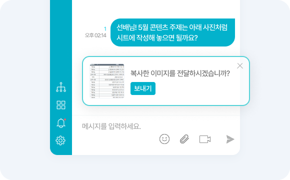 - 화면 캡쳐/붙여넣기 기능: 공유가 필요한 화면은 바로 캡쳐 및 붙여넣기 하여 간편하게 전송