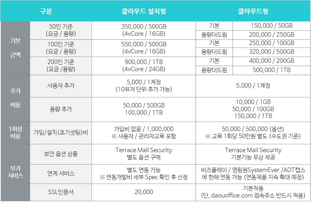 그 외에도 메일 대용량 첨부 정책관리, 고객사 전담 담당자(PM) 여부, 멀티컴퍼니 기능 관리 범위, 모바일 APP 아이콘 고객사 로고 적용 등 제공되는 서비스에 약간의 차이가 있습니다.