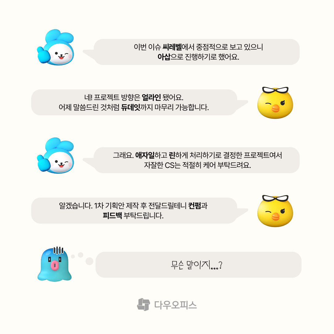 어떡하죠? 😥 다다 과장과 오늘 대리의 대화를 스피키 신입사원은 이해하지 못했어요.