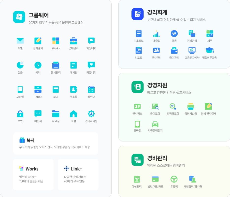 그룹웨어부터 경리회계, 경영지원, 경비관리까지