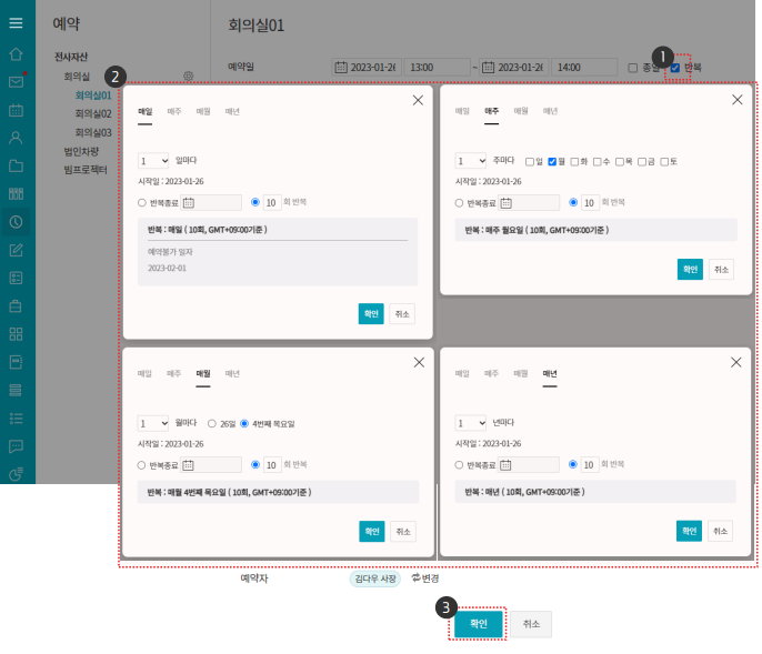 회의 날짜에 맞춰 주기별 예약 설정이 가능하죠.
