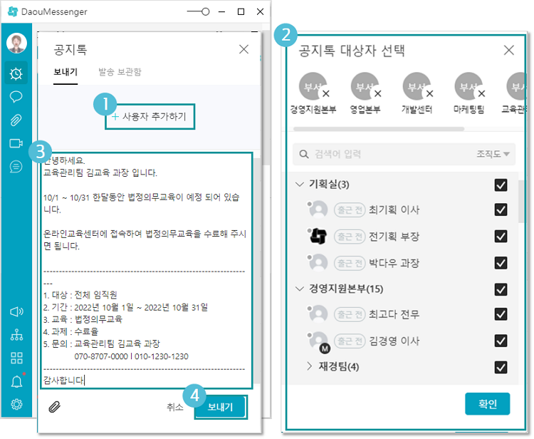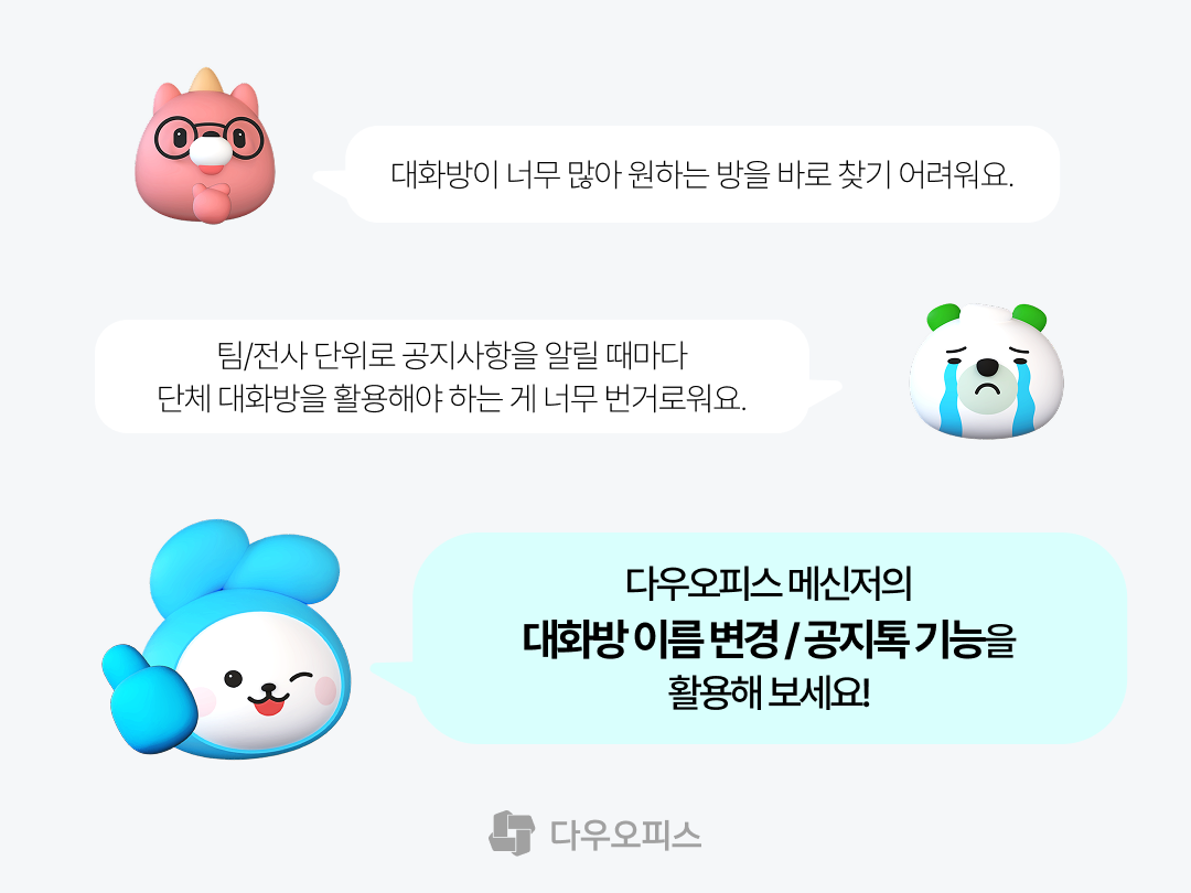 다우오피스 메신저의 '공지톡' 기능을 활용하면 해결할 수 있죠!