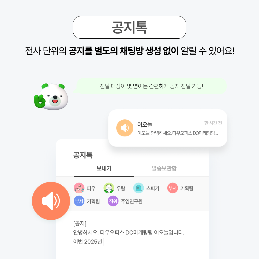 ✨ 공지톡 발송은 인원 제한이 없어요. 손쉽게 전사 공지를 전달해 보세요!