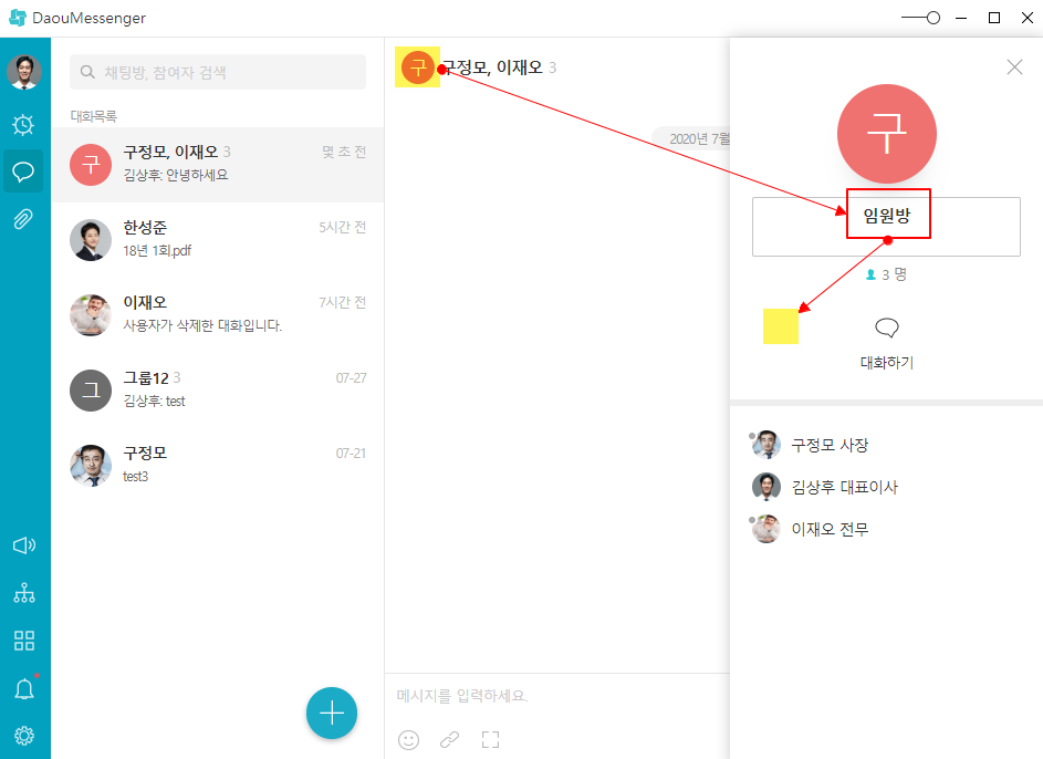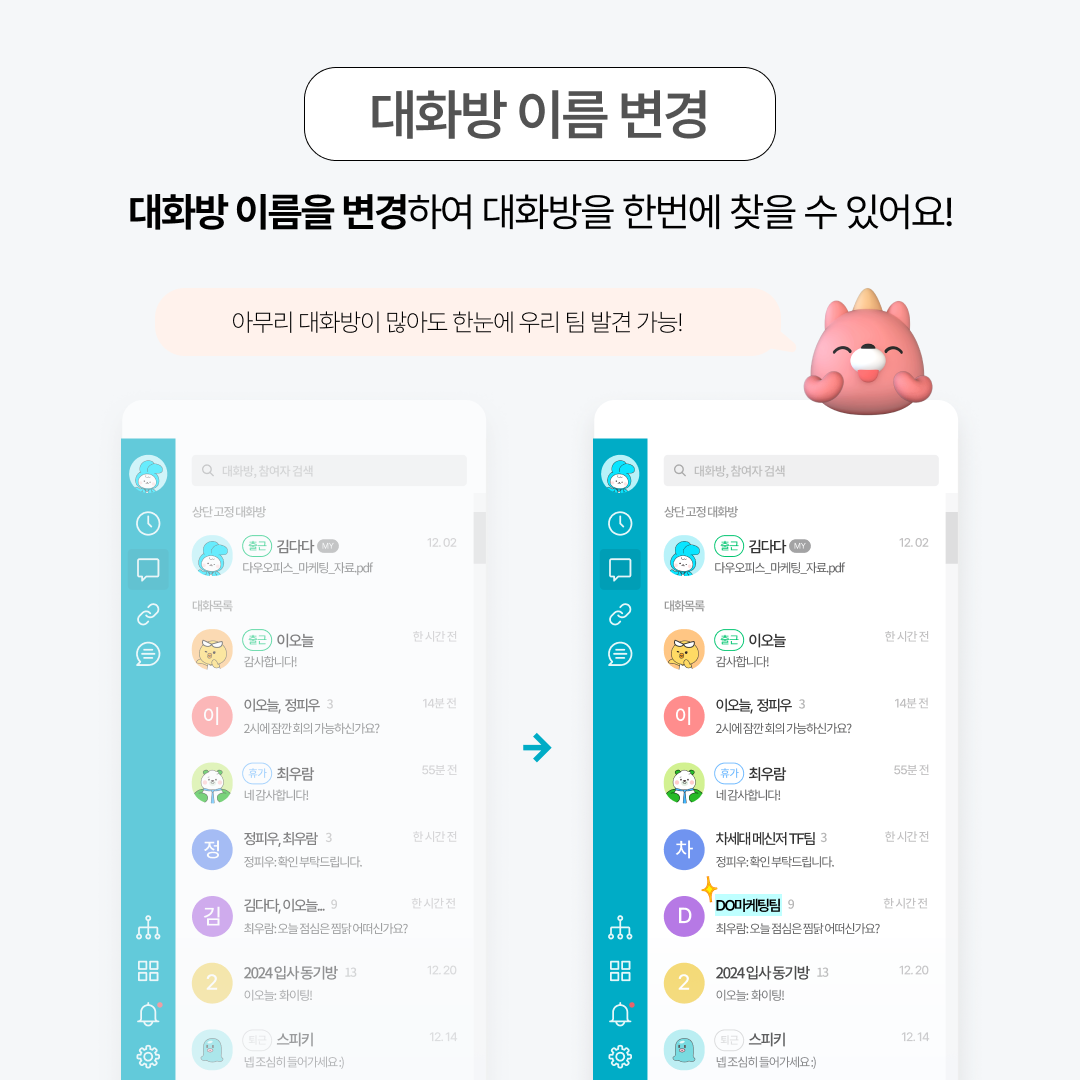 다우오피스 메신저의 '대화방 이름 변경' 기능을 활용하면 해결 완료!
