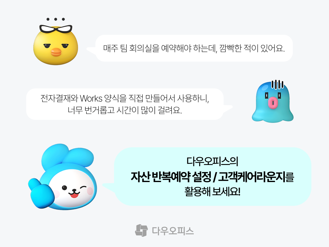다우오피스의 기능들을 활용하면, 오늘 대리와 스피키 사원의 고민 해결도 무조건 가능하죠! 😎
