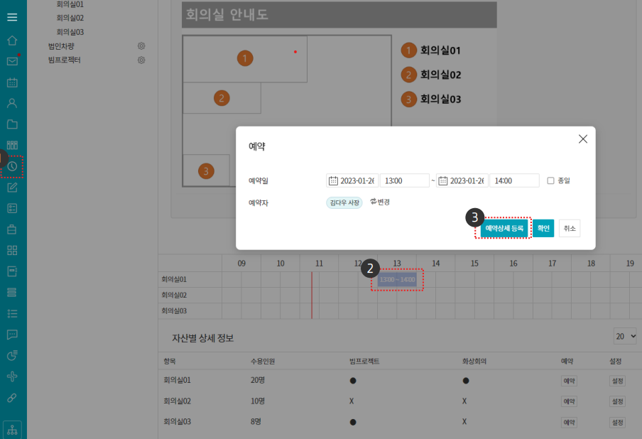 [예약] 클릭 → 자산 반복예약 등록할 자산의 이용 시간을 마우스 드래그 → 팝업창에서 [예약상세 등록] 클릭