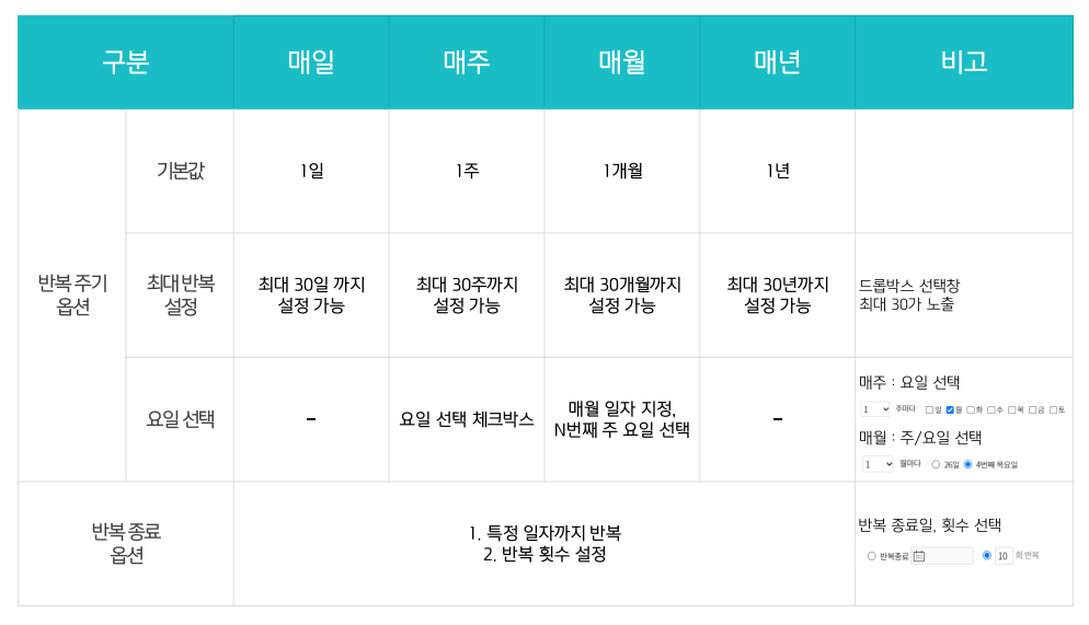 위의 표를 참고하여, 주기별 반복 예약을 설정해 보세요!