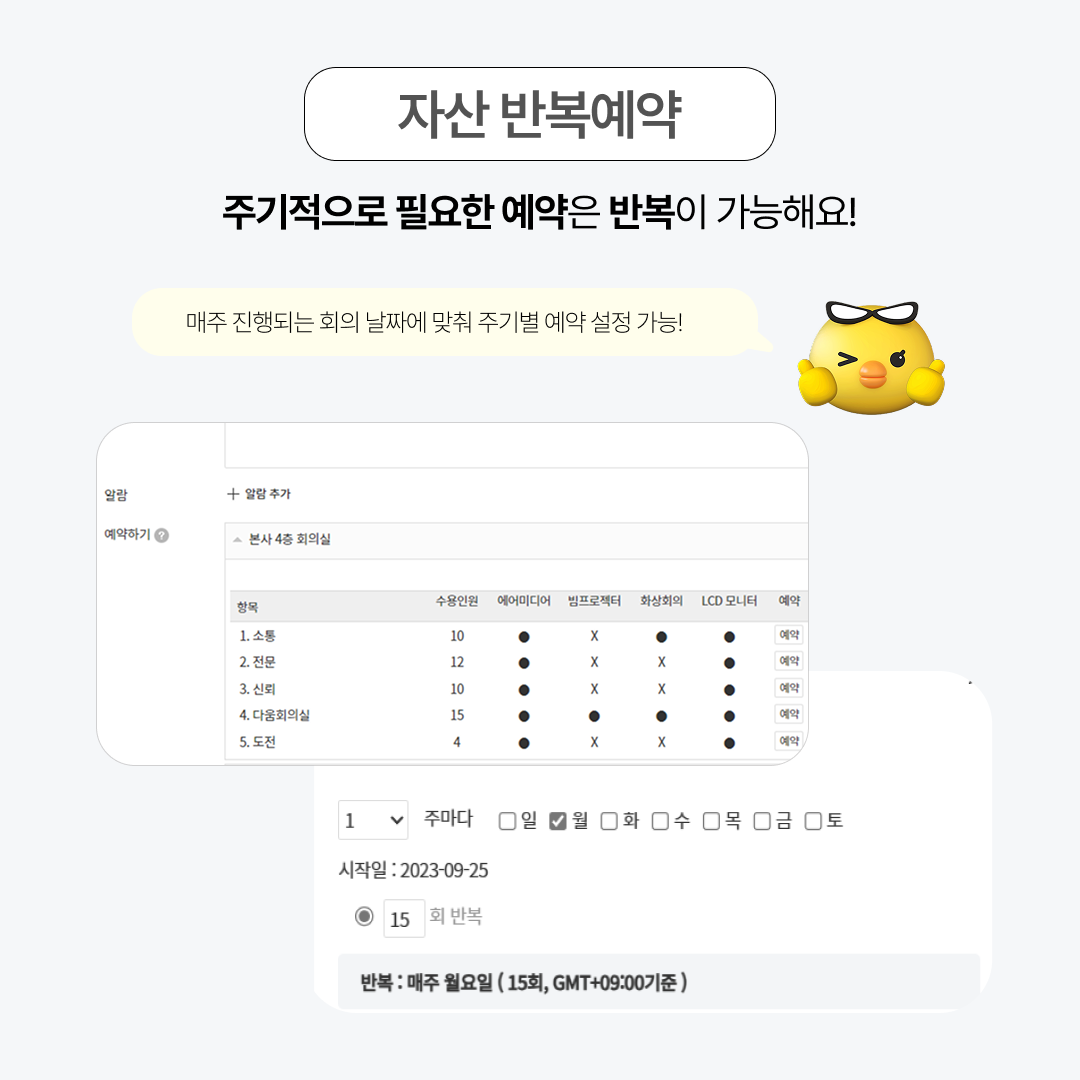 매주 회의에서 사용하는 회의실처럼, 주기적으로 예약이 필요하다면 반복 설정할 수 있어요!