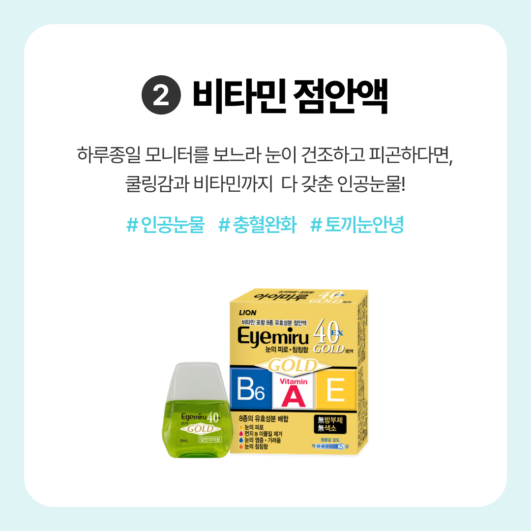 각종 비타민과 각막 보호 성분으로 눈 컨디션을 지켜주는 인공눈물을 사용해 보세요.