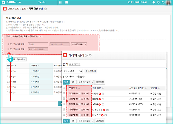 ▶ Works의 목록 화면 관리에서 문서번호 사용 설정을 하면 데이터를 문서번호로 관리할 수 있습니다.