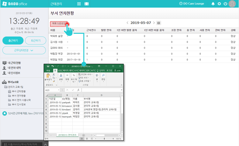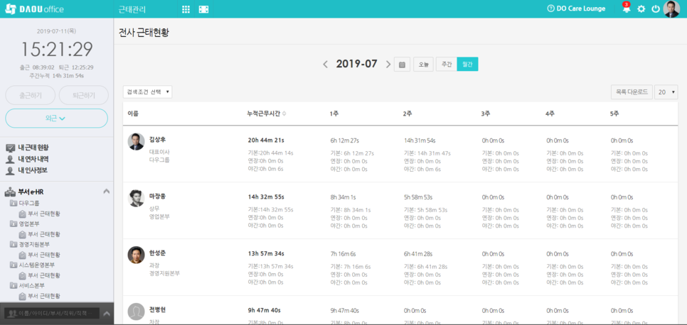 ▲ 전 직원의 근무시간을 비롯한 근태현황을 한눈에 파악할 수 있어 주52시간근무에도 적절히 대응이 가능합니다.