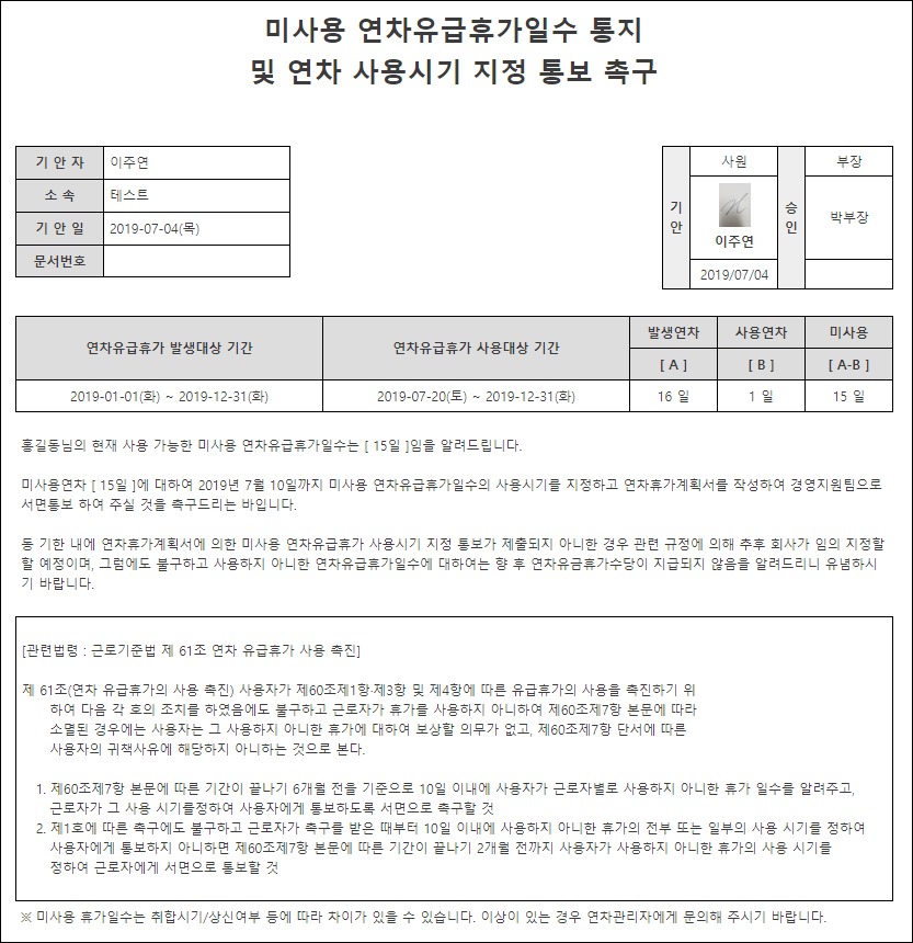 여기서 중요한 점은 모든 통보와 촉구가 서면으로 이루어져야 한다는 점인데요. 기업의 연차 사용 촉진과, 근로자의 사용 계획 통보 모두 문서 작성, 즉 서면을 통해서 이루어져야 합니다. 단, 회사가 전자결재 체계를 완비하여 전자문서로 모든 업무의 기안과 결재, 시행과정이 이루어져 전자결재를 통해서 근로자 개개인에게 명확하게 촉구, 통보되는 경우에 한해서 '서면'으로 인정됩니다. 그 동안 일일이 서면으로 작성 받고, 통보하고 번거로웠을 인사담당자 분들께는 희소식!!