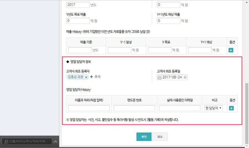 영업팀에서 신규 고객 사 발굴 시, 고객사 기본정보, 컨텍포인트, 매출정보, 영업담당자 데이터 등을 입력하고 진행되는 상황에 대해 영업팀 및 협업하는 동료들과 히스토리를 공유할 수 있습니다.