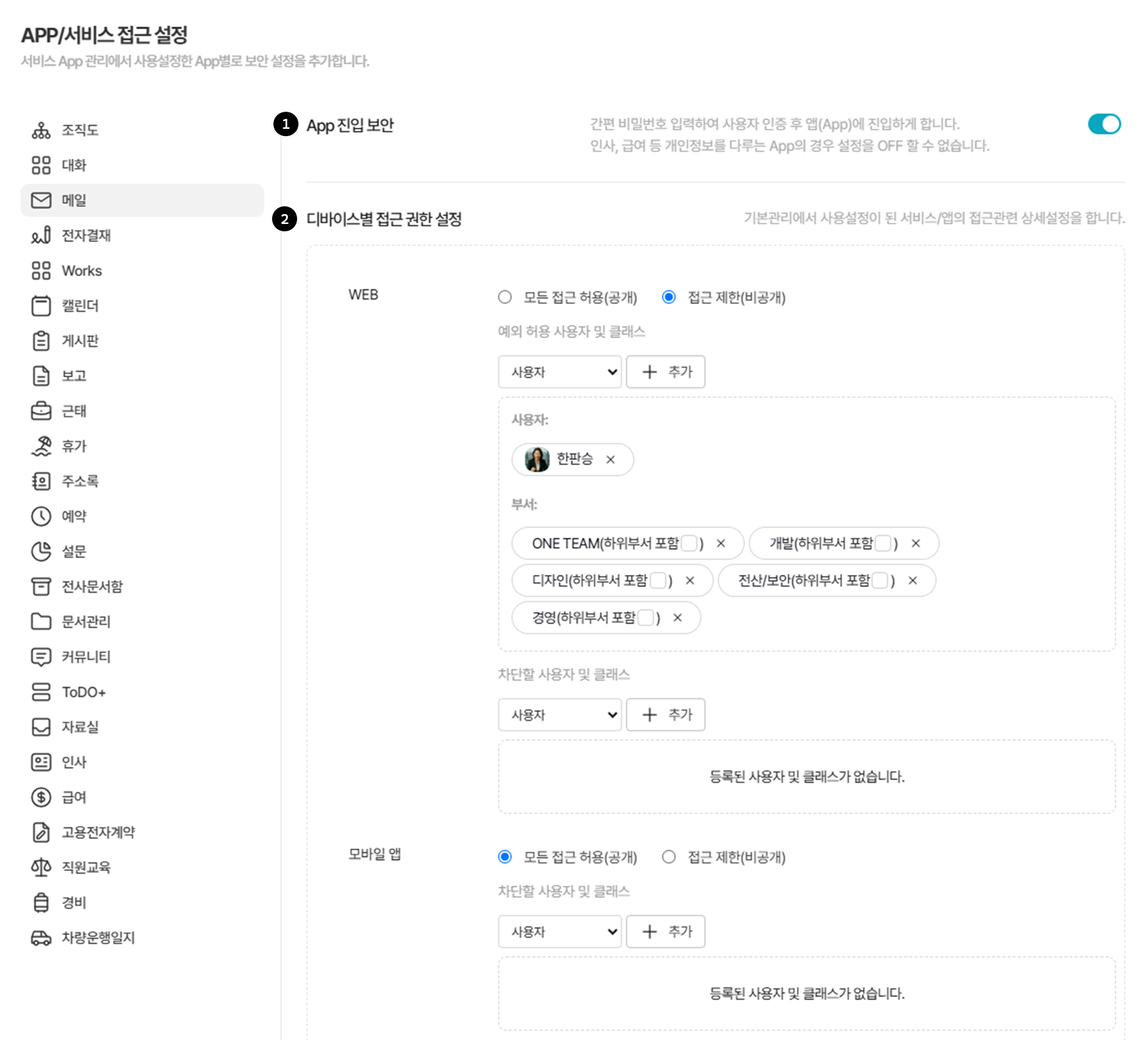 – 통합 설정 메뉴에서 세부적으로 접근 제어 및 사용 권한 관리 가능