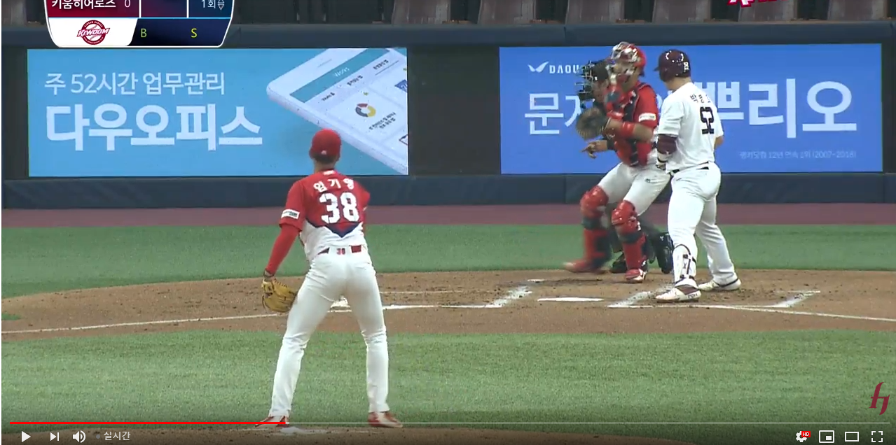 투수가 공 던지는 가장 중요한 순간!! 그룹웨어 다우오피스 광고가 보이네요!
