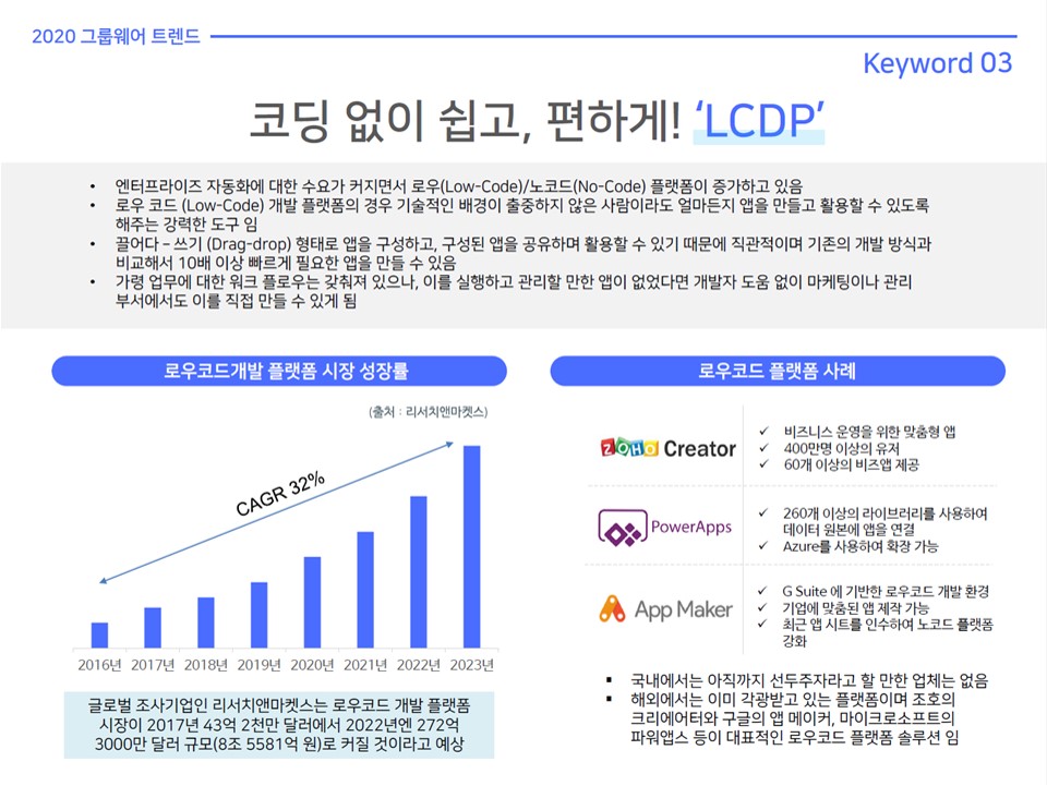 'Low-Code-Development Platform'의 약자로 기술적인 배경이 없는 사람이라도 손쉽고 빠르게 원하는 앱을 만들어 쓸 수 있는 플랫폼을 말한다.