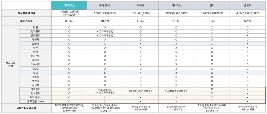 가격, 기능 수, 협업 지원 여부, 인사·경리 기능 제공 여부까지 전반적인 스펙을 한눈에 비교해드립니다.