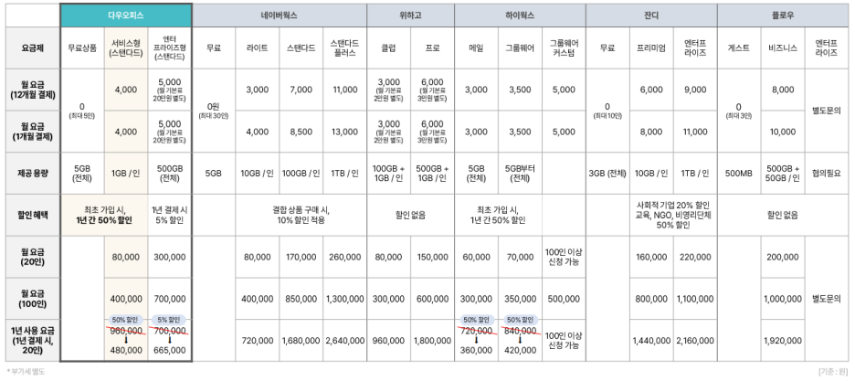 하지만 국내에 출시된 다양한 협업 솔루션을 비교하다 보면, 가격은 비슷해 보여도 제공 기능은 천차만별이고,