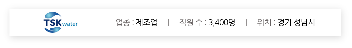 TSK워터는 국내 수처리 운영관리 시장의 No.1 회사로 상·하수도사업, 폐기물 처리 및 에너지화 사업의 개발, 설계, 시공, 운영관리에 이르기까지 미래 환경사업 전반에 대한 Total Solution을 제공하는 회사입니다.