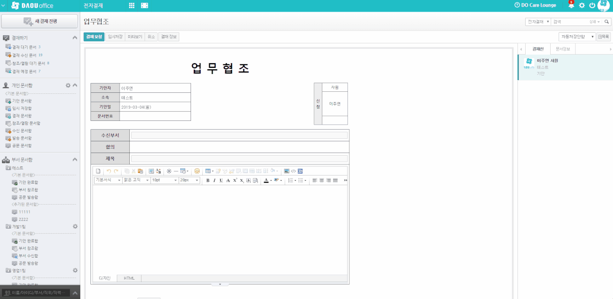 Works나 ToDO+기능 활용도도 높습니다. Works를 통해 매출이나 고객 관리, 비품 대여 관리 등의 공유가 수월해졌고, 팀 간 업무 진행 상황을 쉽게 파악할 수 있게 되어 효율적인 업무 처리가 가능해졌습니다. ToDO+기능은 포스트잇처럼 간편하게 개인의 업무를 정리할 수 있기도 하고, 할 일 리스트를 생성할 수 있기도 하여 업무 협업에 큰 기여를 하고 있습니다. 무엇보다 전자결재 도입으로 인한 시간 단축이 가장 큰 장점이라고 할 수 있습니다. 결재 프로세스 간편화는 물론, 샘플 양식 또한 100개 정도 제공하고 있어 회사 양식에 맞게 수정하여 현재 잘 사용하고 있습니다. 지금은 그룹웨어 없이는 업무가 진행되지 않을 정도로 다우오피스가 회사 업무의 많은 부분을 차지하고 있습니다.