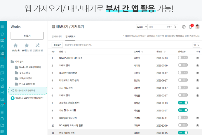 Works의 주요 기능으로는 데이터 분석, 데이터 연동, 접근제어, 앱 가져오기/내보내기가 있답니다.