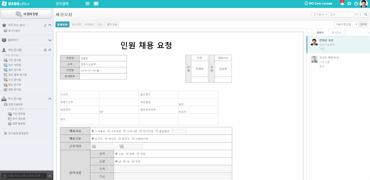 [다우오피스 전자결재 기능: 전자결재 피드백 예시]