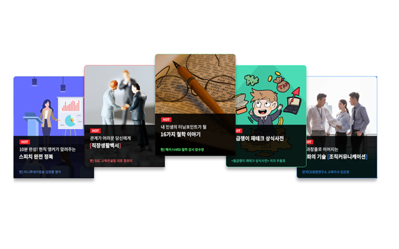1) 글로벌 역량 강화 교육: 비즈니스 영어 회화, 중국어, 특수 외국어 등 해커스HRD 교육 노하우가 그대로 담긴 외국어 특화 강좌로 글로벌 인재 육성 2) 금융 전문 자격 과정 : 금융3종, 세무 회계, 외환전역 등 프로 금융인을 위한 원스탑 금융강의 3) 법정의무교육 : 자체 제작한 고퀄리티의 개인정보보호, 직장 내 성희롱 예방, 장애인 인식 개선, 산업안전보건교육 등 필수 교육 콘텐츠 4) 공통역량 교육 : 기획 및 보고, 협상 능력, 커뮤니케이션 등 직장 생활을 위한 길잡이 강의를 통해 개인의 전문성 증가 및 기업의 성과 창출 도모