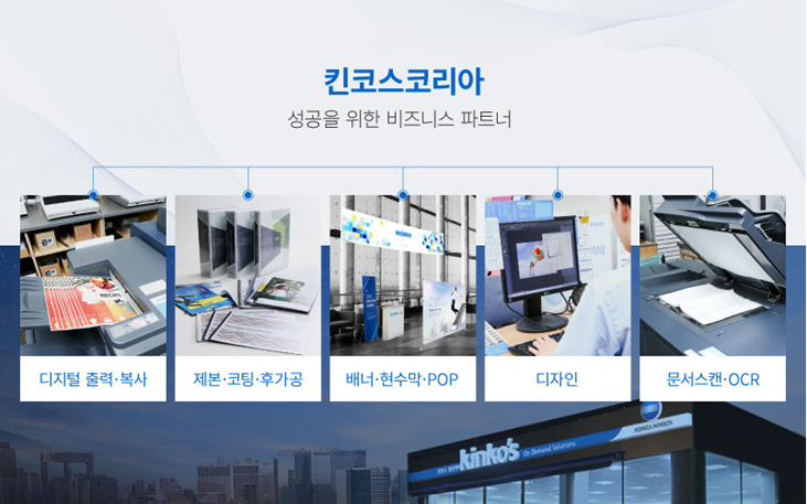 컬러 출력, 제본, 디자인, Signs & Graphics 등의 다양한 솔루션과 비즈니스 서비스를 제공하고 있습니다.