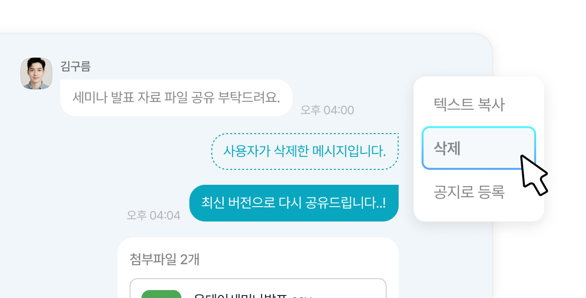 • 실수로 보낸 메시지나 첨부파일을 확인 여부와 관계없이 즉시 삭제