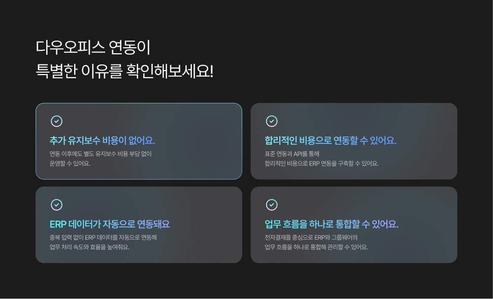 다우오피스 ERP 연동의 가장 큰 강점은 바로 유지보수 비용이 전혀 발생하지 않는다는 점입니다.