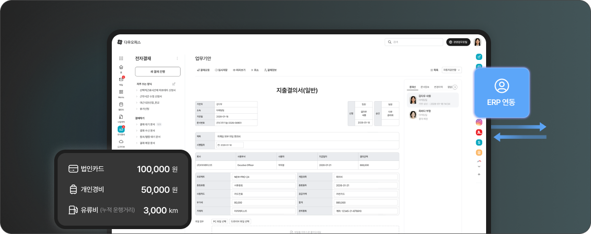 모든 데이터는 ERP 시스템과 실시간으로 연동되어 결재, 승인, 정산이 하나의 자동화 흐름으로 연결됩니다.