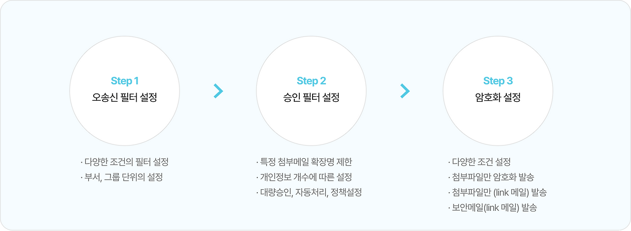 이 3단계 방어 체계 덕분에 스팸메일·피싱메일·바이러스메일 유입률을 감소시킬 수 있습니다.