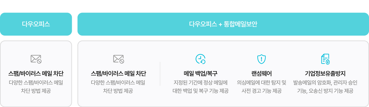 다우오피스 통합메일보안은 스팸/바이러스 메일 차단, 랜섬웨어 방어, 메일 실시간 백업·복구,