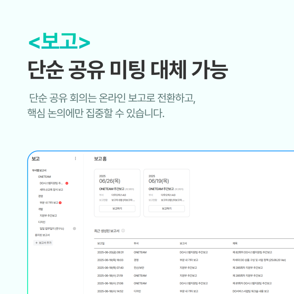 정기 보고서: 주간·월간 자동 생성 → 반복 미팅 불필요