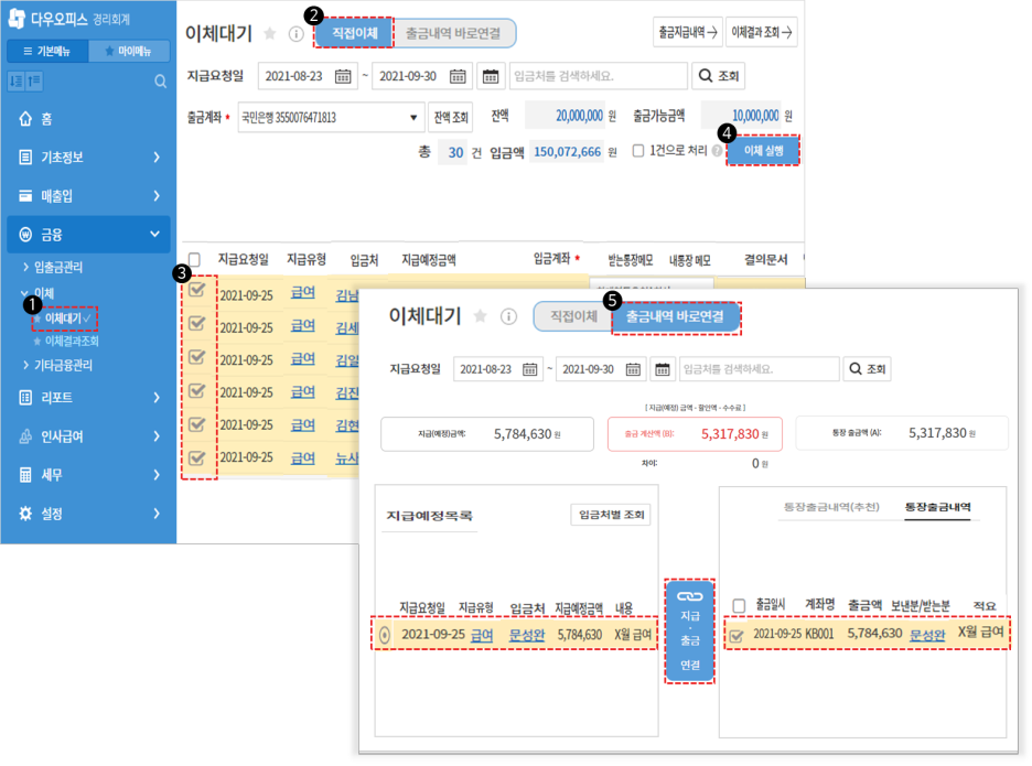 급여 이체를 완료했다면 급여 지급 관련 출금 내역과 지급내역을 연결해볼까요?