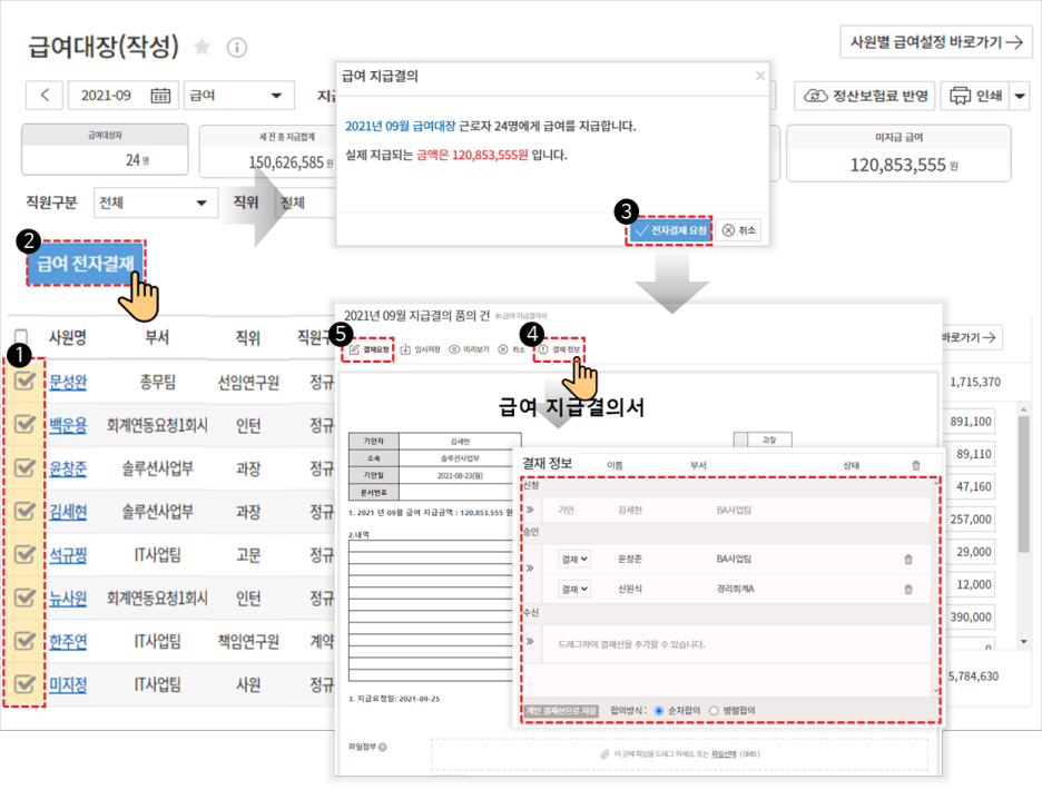 급여대장 작성 후 다우오피스 전자결재 연동을 통해 결재를 상신해주세요