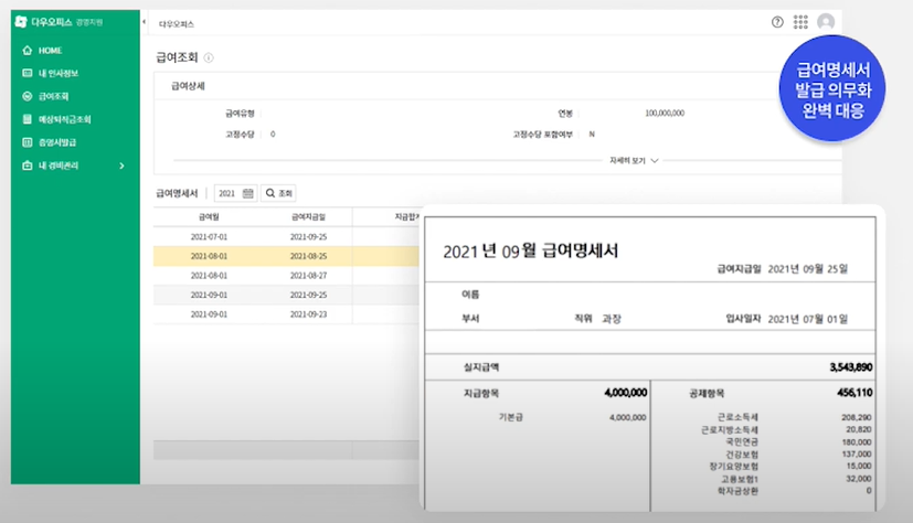 다우오피스 급여조회 기능은 임직원들이 자유롭게 급여 내역 조회부터 급여명세서 발급까지 처리할 수 있어 효과적입니다. 또한 급여명세서 필수 기재 사항도 빠짐없이 들어가 있어 급여명세서 발급 의무화에 발 빠른 대응이 가능했습니다.