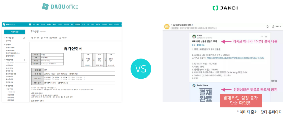 다우오피스와 잔디의 전자결재 화면을 비교해볼게요.