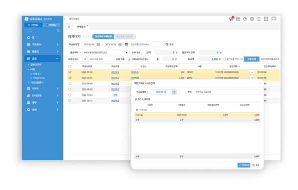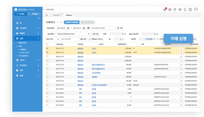 다우 오피스의 경리회계 시스템은 서비스 내에서 자유롭게 대금 이체를 할 수 있고,