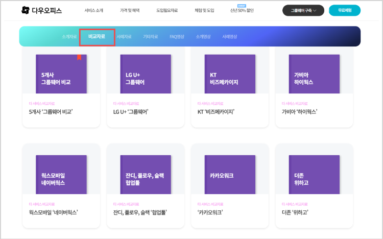 다우오피스를 포함해 LG U+, KT비즈메카이지, 가비아 하이웍스, 네이버웍스, 잔디, 카카오워크, 더존 위하고, 두레이 등, 시중 8개사 제품의 비교 자료를 제공합니다.