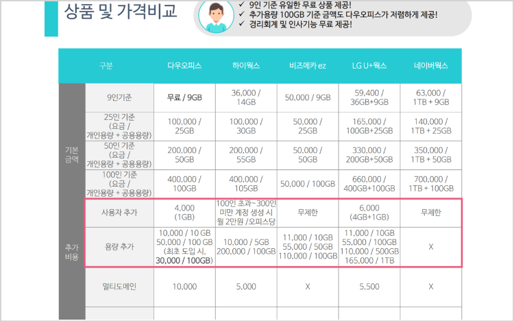 가격, 용량, 기능, 연동 서비스 등 그룹웨어 도입 시 고려해야 할 모든 항목을 세세하게 분석해서 비교하실 수 있습니다. 아마 담당자분들께는 대안 선택 시 가장 유용하게 활용하실 자료가 될 것 같습니다.