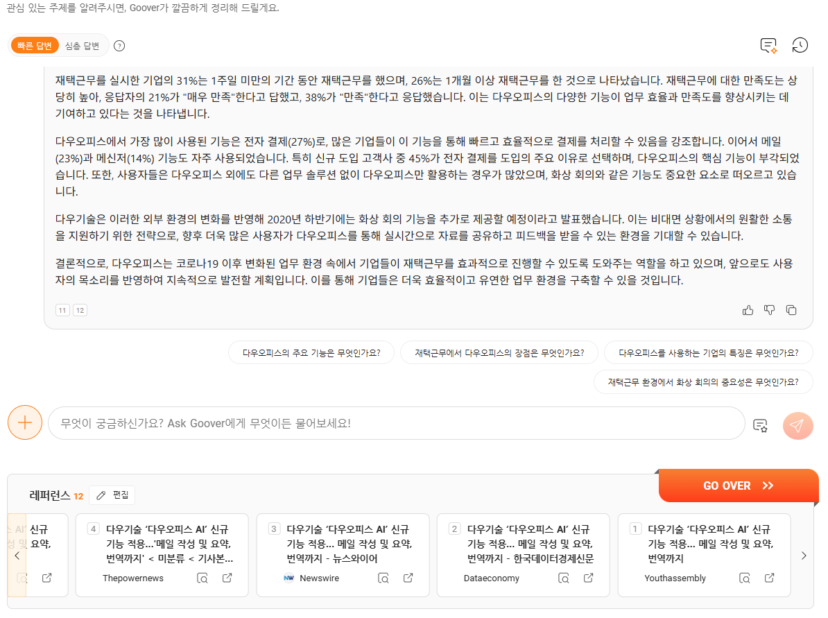 블로그 지기는 'AI 검색' 목적을 선택 후 다우오피스에 대해 알려달라고 요청해 보았는데요,