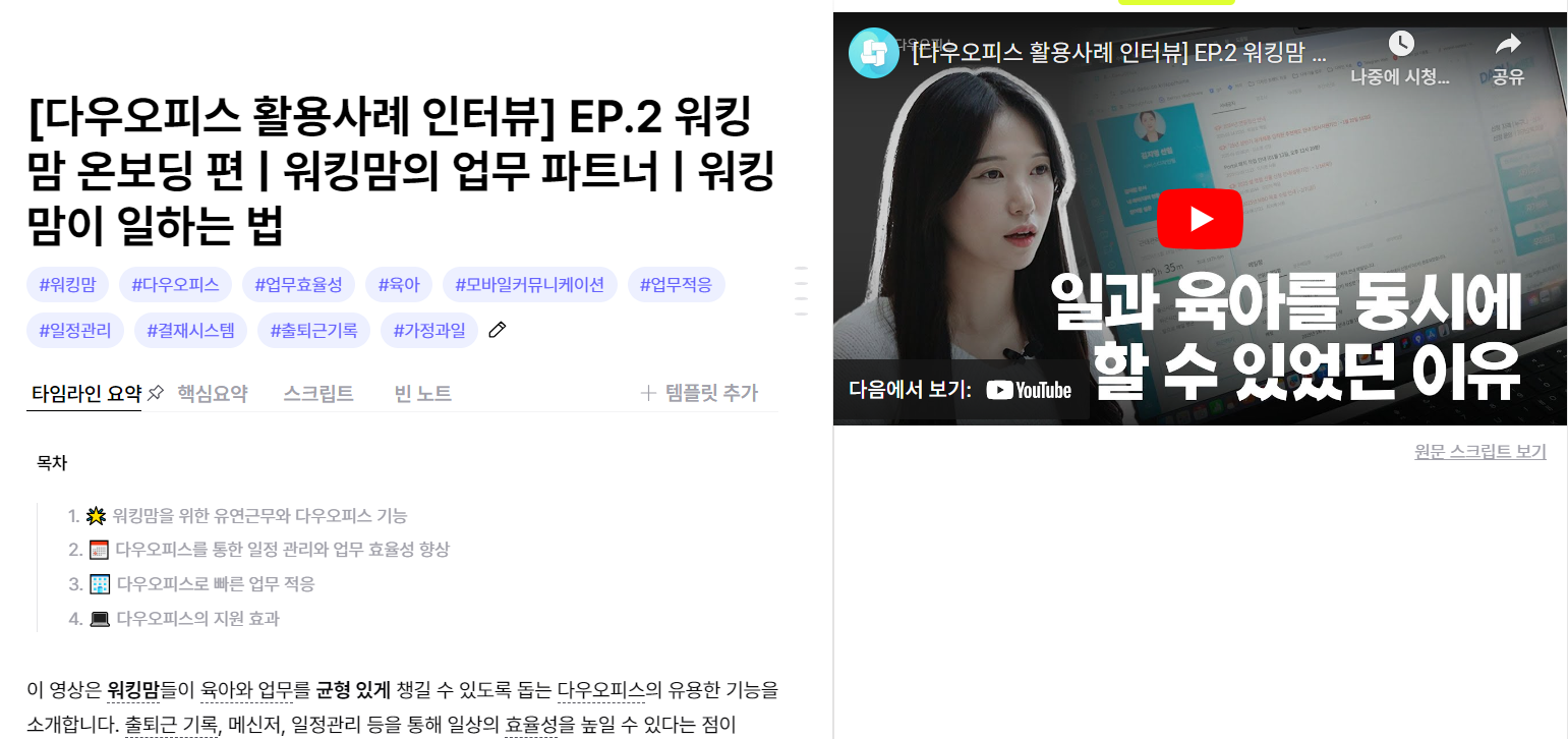 블로그 지기는 다우오피스 유튜브의 [다우오피스 활용사례 인터뷰 - EP.2 워킹맘 온보딩 편] 링크를 입력해보았는데요,